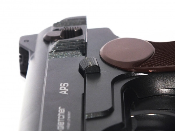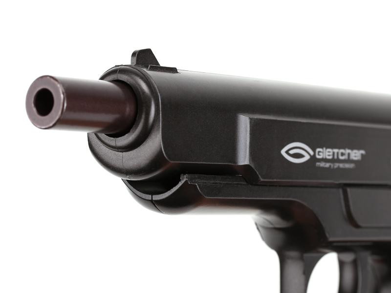Корпус пистолета и почти все детали выполнены из легкого сплава, рукоятка пистолета отделана пластиком и внешне в точности повторяет оригинал, емкость магазина составляет 22 сферические пульки, калибра .177 / 4.5мм. Затворная задержка и рычажок предохранителя также достаточно точно воспроизводят оригинал. Но нужно отметить, что этот пневматический пистолет в отличие от своего боевого аналога, стрелять автоматическим огнем не может, связано это в первую очередь с тем, что в ряде стран, автоматическая пневматика запрещена законом. Gletcher APS оснащен регулируемым целиком прицела.